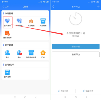 在【工作台—CRM—市场管理-客户拜访】 ,然后点击页面客户拜访空白区域,进入到客户拜访查看页面,客户拜访分为计划拜访以及临时拜访。 ,然后点击页面客户拜访图标,进入到客户拜访查看页面,客户拜访分为计划拜访以及临时拜访。