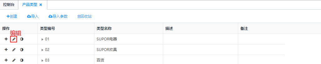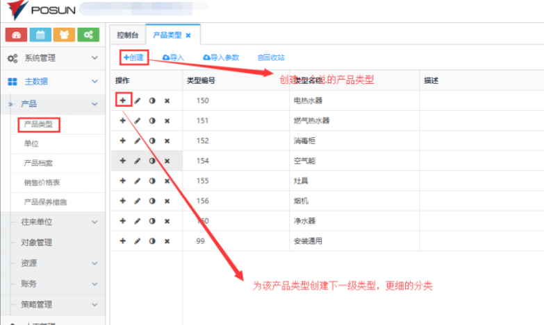 第一步:创建产品类型,有两种方式:一种是点击<创建>按钮创建一个范围较大的产品类型;另一种是点击列表操作栏的<+>按钮,为存在的类型创建下一级类型。