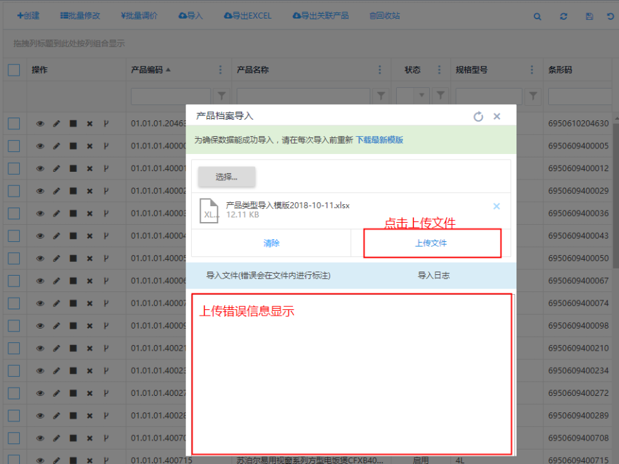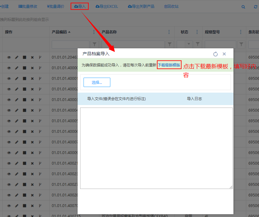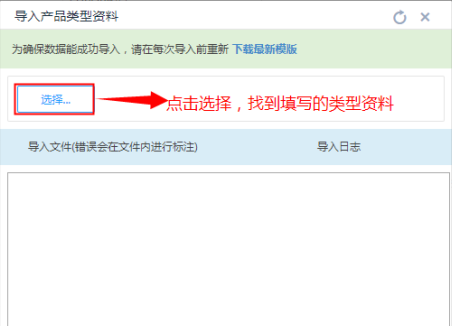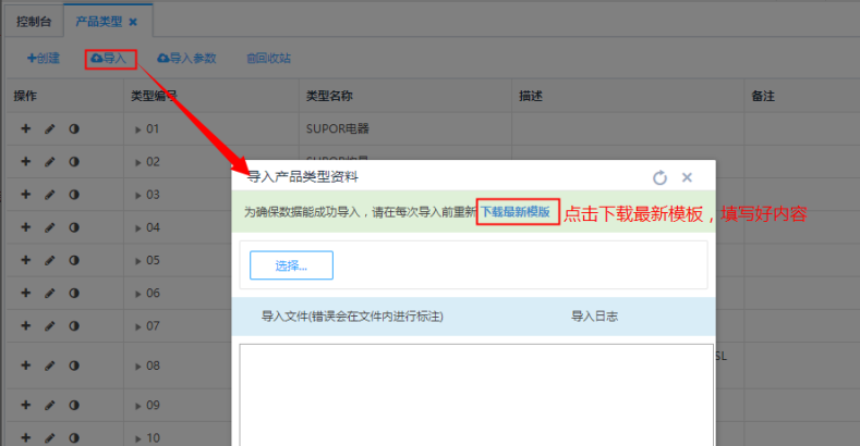第一步:点击列表上方的<导入>按钮,在产品类型导入页面点击<下载最新模板>填写好内容: