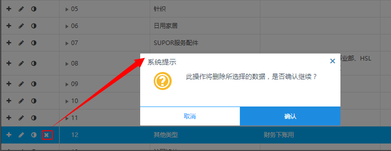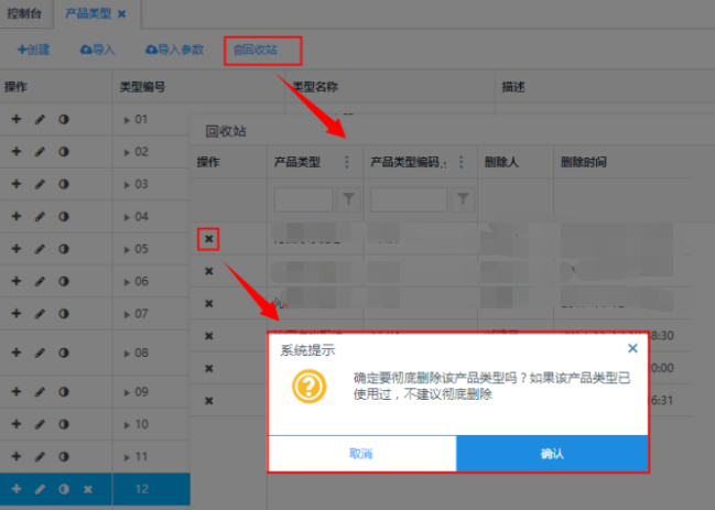 未使用的产品类型,点击<删除>按钮,弹出提示,点击提示上的<确认>按钮,删除该条记录;点击提示上的<取消>按钮,则返回不删除。
