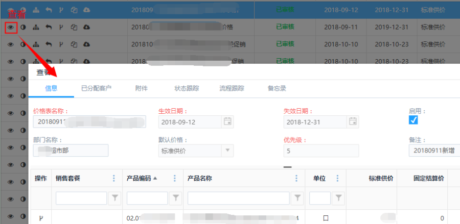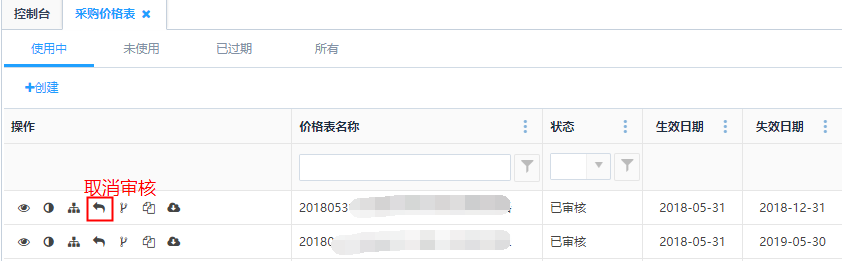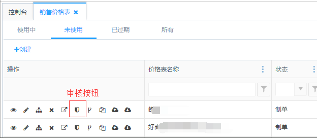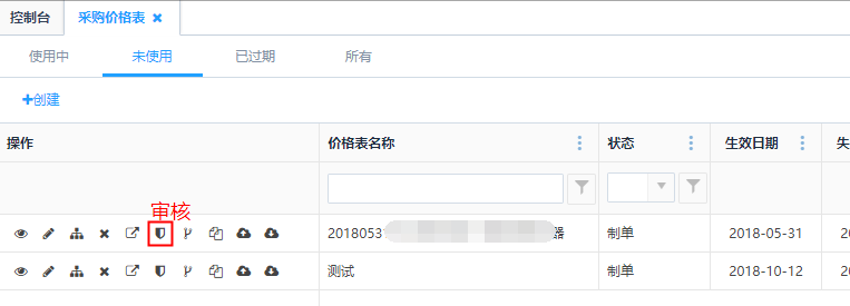点击<审核>按钮之后,价格表变为"已审核"状态,将被统计在使用中列表。
