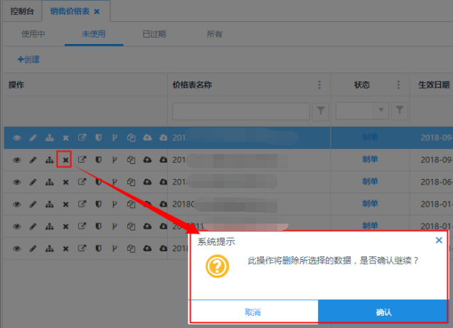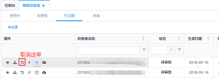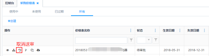 对于"待审批"状态的价格表可点击操作栏的<取消送审>按钮,单据状态转换为"制单",就可以对单据进行修改和删除操作。