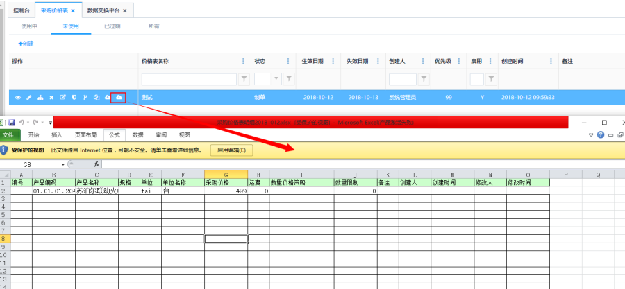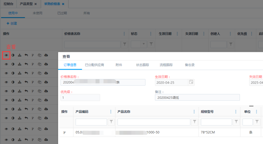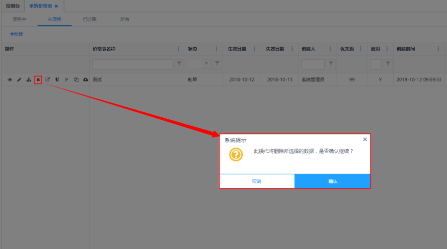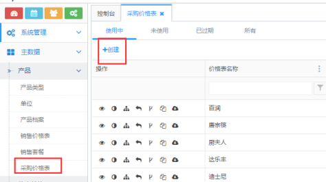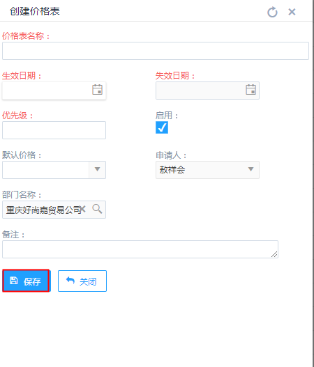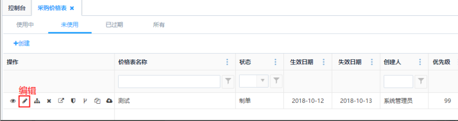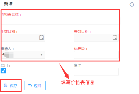 第二步:进入创建页面填写采购价格表名称,生效日期,失效日期,优先级和勾选启用,然后点击保存。新建的价格表为制单状态,在未使用列表中。