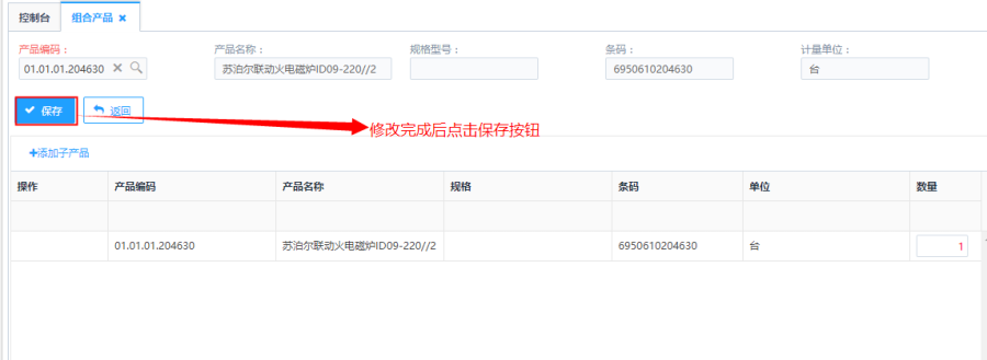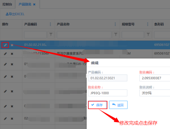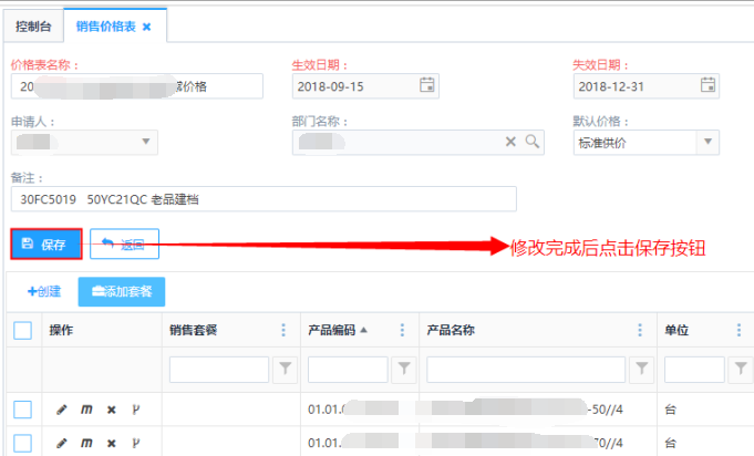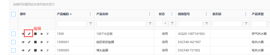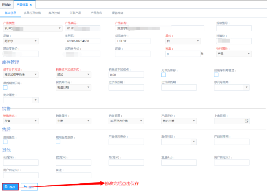a.单独修改:在操作栏点击<编辑>按钮,便会跳转到产品档案详情页面,编辑完后点击保存即可。