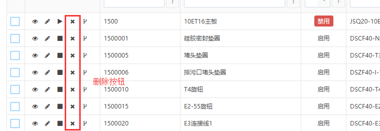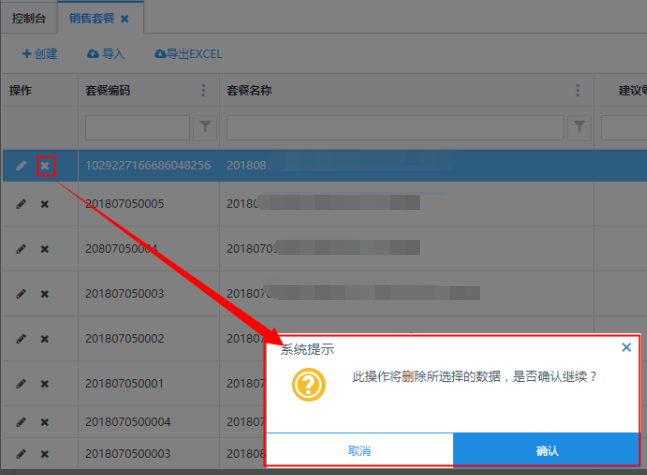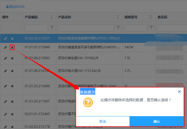点击<删除>按钮,弹出提示,点击提示上的<确认>按钮,删除该条记录;点击提示上的<取消>按钮,则返回不删除。