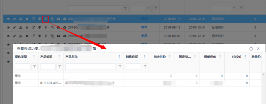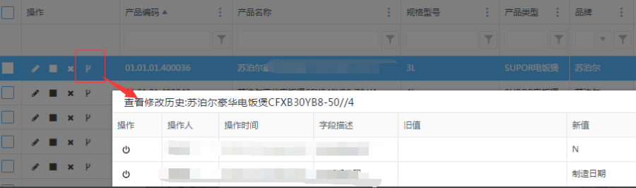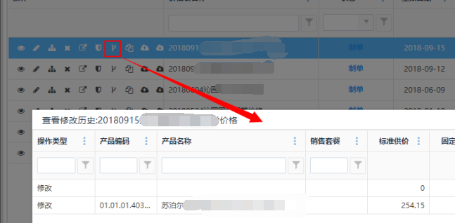 点击列表操作栏内的<修改历史>按钮,给出的弹框内会显示数据的修改记录。