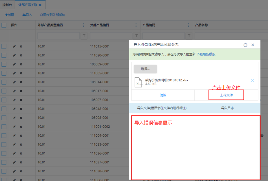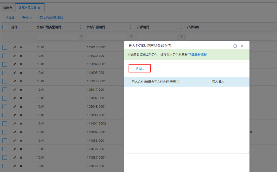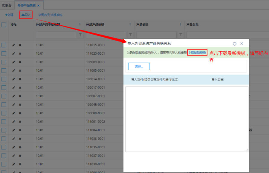 第一步:点击列表上方的<导入>按钮,在外部系统关联导入页面点击<下载最新模板>填写好内容: