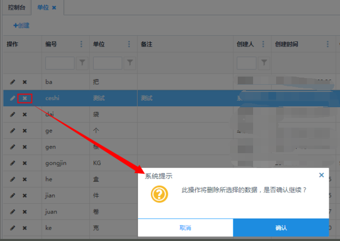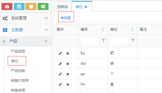注:单位的编号不能重复,系统中的单位创建完成后,尽量不要去删除,可能产品中用到了单位,会导致数据出错。