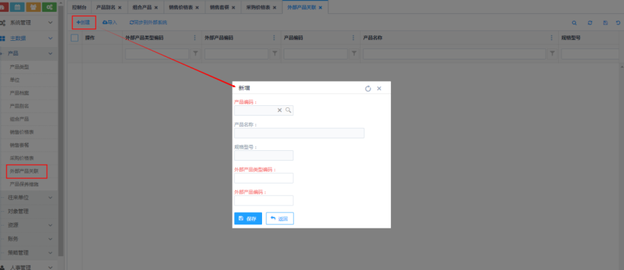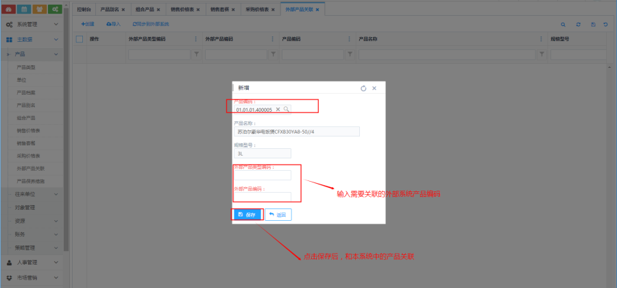第二步:选择产品,输入外部产品类型编码、外部产品编码然后点击保存