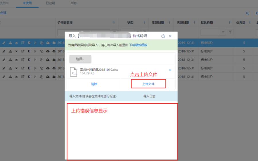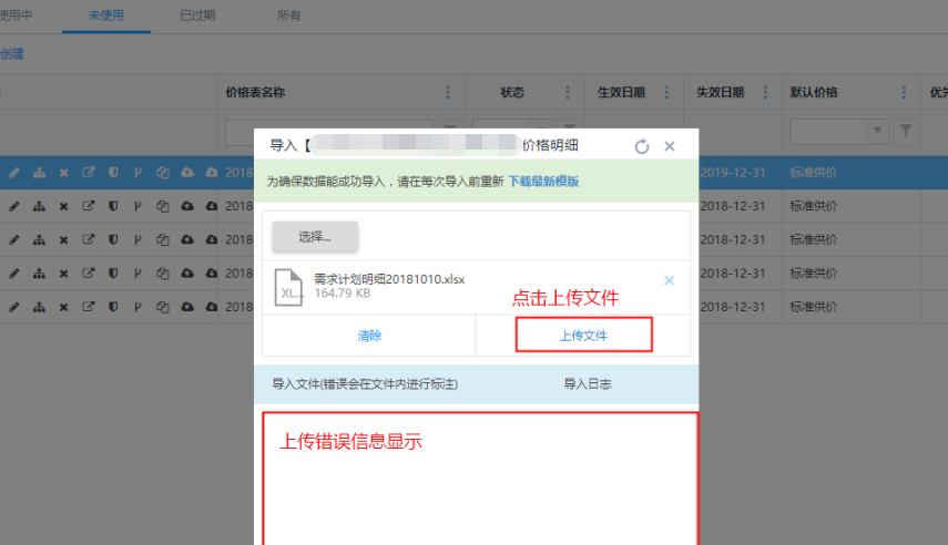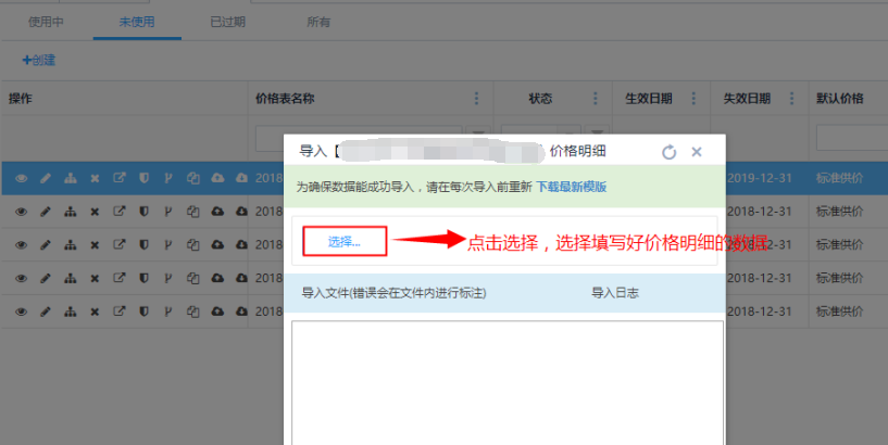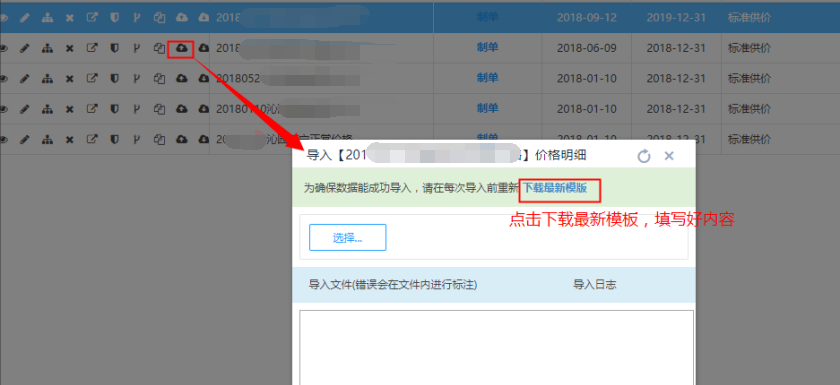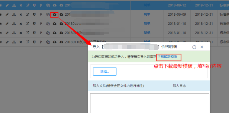 第一步:点击列表上方的<导入>按钮,在价格明细导入页面点击<下载最新模板>填写好内容: