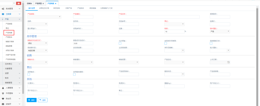 - 物料属性:根据产品属性分为产品、配件和赠品,如:若产品为赠品的时候需要选择该项以区分是否为赠品。