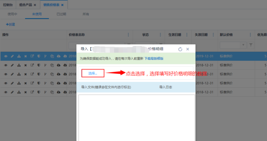 点击<导入>按钮可导出所有价格表产品明细;导入操作如图: