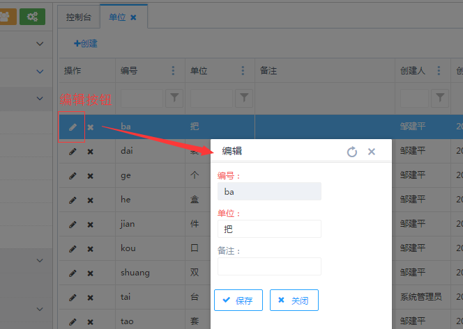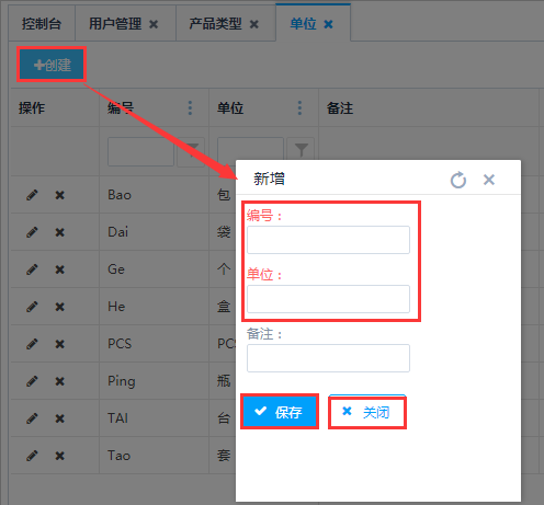 点击界面左上方的<创建>按钮将弹出一个创建弹框,如图所示;填写好编号、单位及备注相关信息后点击<保存>