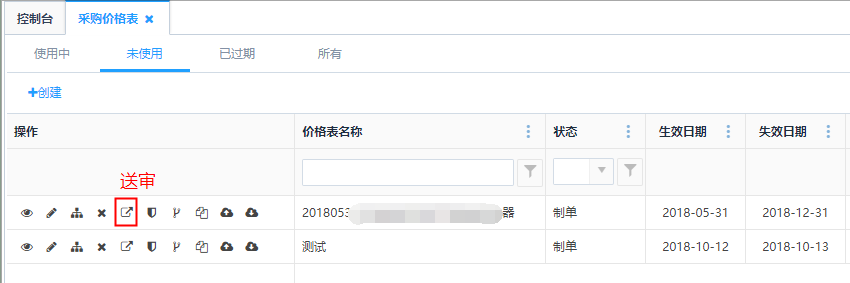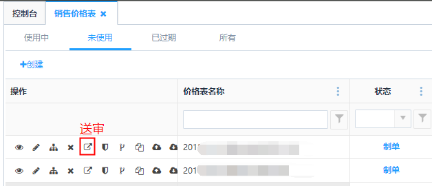 对于"制单"状态的价格表可点击操作栏的<送审>按钮,单据状态转换为"待审批",将不能再进行修改和删除操作。
