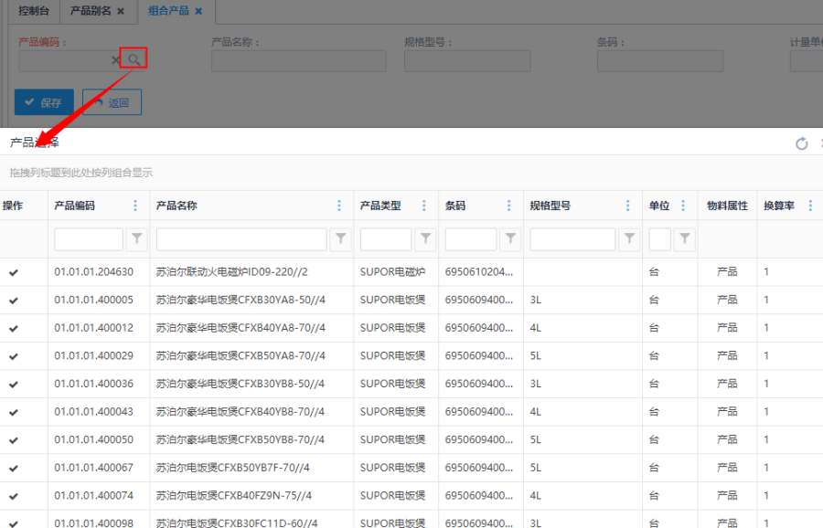 第一步:点击页面左上方<新建>进入到组合产品新建页面,选择产品: