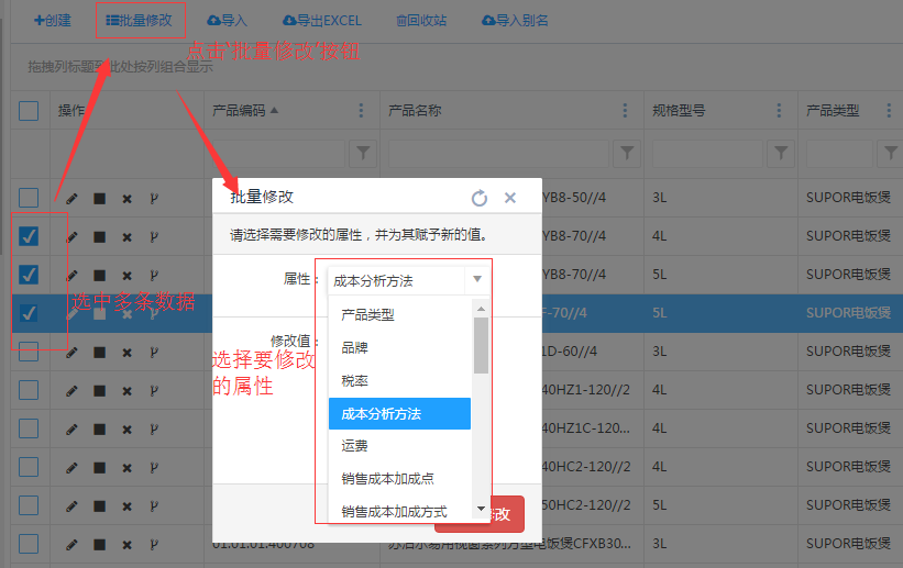 b.批量修改:选择多条数据后,点击<批量修改>按钮,在给出的弹框中选择要修改的属性后再填上值确认即可。如图