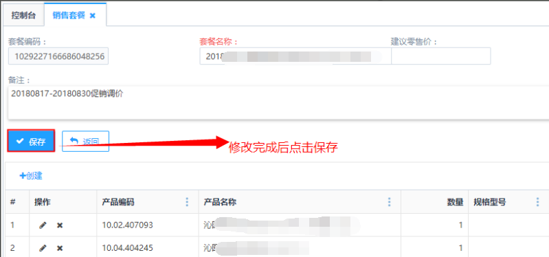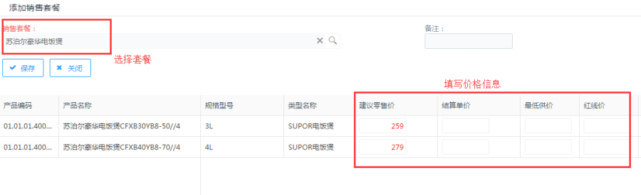 选择套餐,填写套餐单品价格,点击<保存>,套餐价格创建成功。