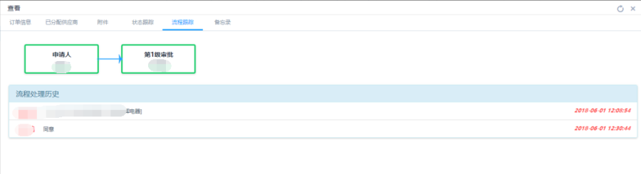 注:当订单为审批中时点击<流程跟踪>,可查看当前的审批节点和审批人信息。