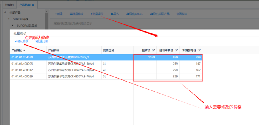 点击列表操作栏内的<批量调价>按钮,给出的弹框内会显示产品的价格。