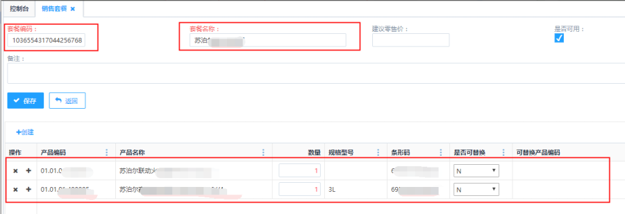 第二步:填写套餐名称、套餐编码,勾选可用,选择套餐产品,然后保存。