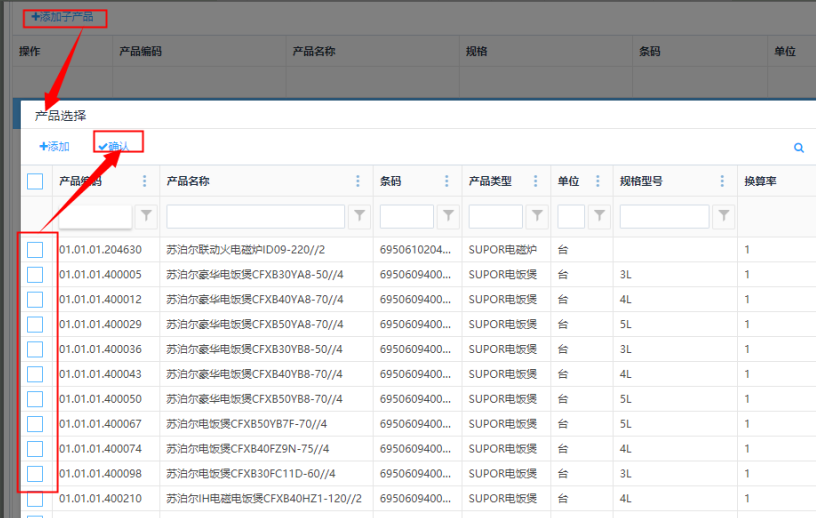 第二步:点击<添加子产品>,勾选产品后点击<确认>
