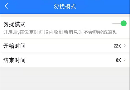 开启后,可以设置在某个时间段内收到新消息时系统不会响铃或震动