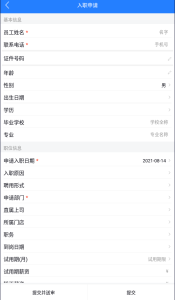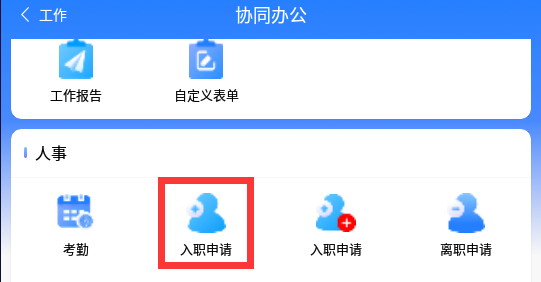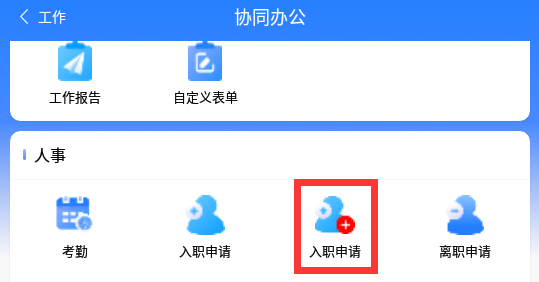 点击带红标【入职申请】的为入职申请功能,点击后填写信息提交送审即可