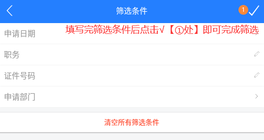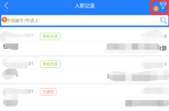 在数据量过多或只想查阅个人的信息的情况下,可以在顶部的搜索框输入申请编号/申请人信息进行查询【①处】,也可点击右上角图标【②处】进行信息筛选
