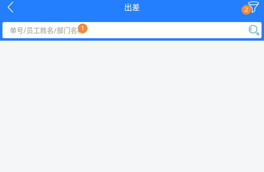 在数据量过多或只想查阅个人的信息的情况下,可以在顶部的搜索框【①处】输入单号/员工姓名/部门名称信息进行查询,也可点击右上角图标【②处】进行信息筛选