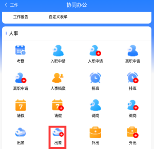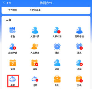 点击带红标【出差】的为出差申请功能,点击后填写信息提交送审即可