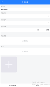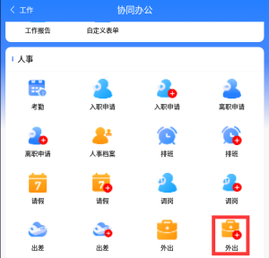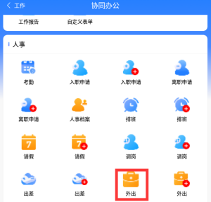 点击带红标【外出】的为外出申请功能,点击后填写信息提交送审即可