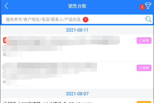 在数据量过多或只想查阅单条记录的情况下,可以在顶部的搜索框【①处】根据服务单号/客户地址/电话/联系人/产品信息输入完整信息进行查询,也可点击详情页标题【②处】进行信息筛选