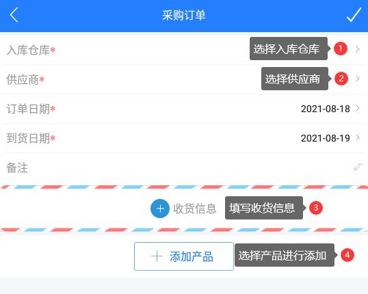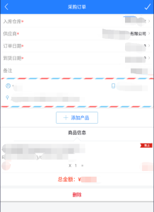点击带红标【采购订单】的为采购订单新增功能,点击后按图示逐一填写信息提交即可。