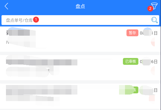 在数据量过多或只想查阅单条记录的情况下,可以在顶部的搜索框【①处】根据盘点单号/仓库输入完整信息进行查询,也可点击详情页标题【②处】进行信息筛选