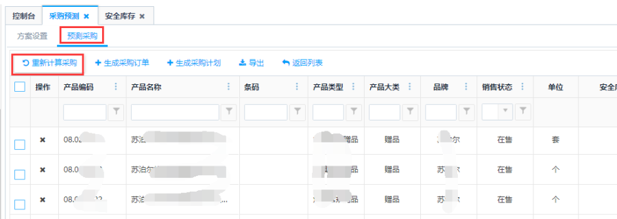 如果数据有误,可以点击预测采购选项卡页面的<重新计算采购>按钮,会刷新界面数据。