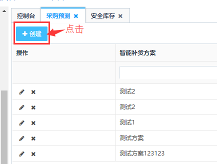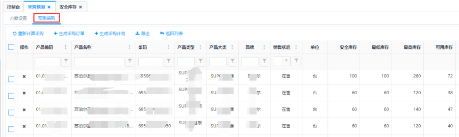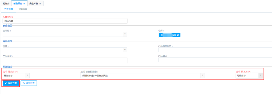 第三步:输入信息后点击<保存方案>按钮。方案保存后会自动打开预测采购选项卡,预测采购选项卡下显示所有满足方案条件的产品。