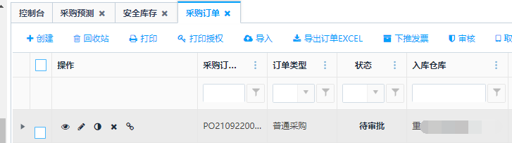 第一步:根据预测采购选项卡下面的产品信息,可以查看哪些产品需要采购,勾选需要的商品,点击<生成采购订单>按钮,跳转到采购订单界面。