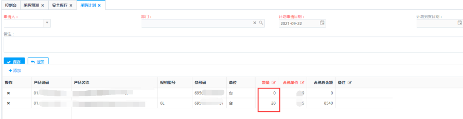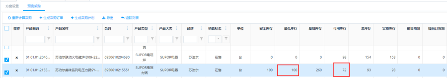 第二步:采购计划页面,如果有设置安全库存/最低库存/最高库存,根据方案选择的"加项-需求库存"显示需要采购多少产品,如果没有设置,则数量为0