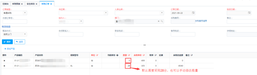 第二步:采购订单页面,如果有设置安全库存/最低库存/最高库存,根据方案选择的"加项-需求库存"显示需要采购多少产品,如果没有设置,则数量为0