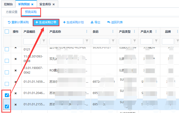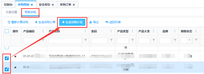 第一步:根据预测采购选项卡下面的产品信息,可以查看哪些产品需要采购,勾选需要的商品,点击<生成采购计划>按钮,跳转到采购计划界面。