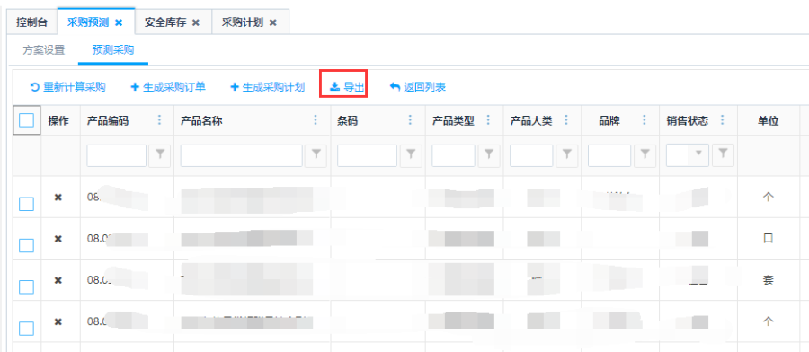 点击列表上方的<导出EXCEL>按钮可导出预测采购列表内容。