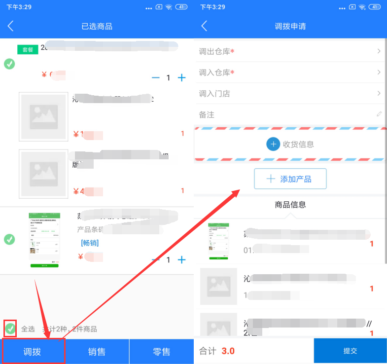 已选商品列表,勾选商品后点击【调拨】按钮,跳转到调拨申请界面,选择调出仓库、调入仓库等信息,点击提交,调拨申请创建成功,清空已选商品列表商品记录。(跟正常调拨流程一样操作)