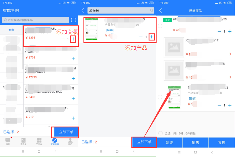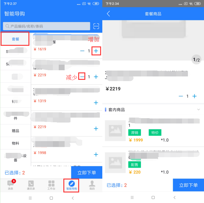 添加套餐和产品后,下面显示已选择数,点击<立即下单>按钮,跳转到已选商品列表界面,这里显示需要下单的商品。