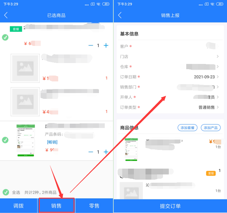 已选商品列表,勾选商品后点击【销售】按钮,跳转到销售订单界面,选择界面上的信息后,点击提交,销售订单创建成功,清空已选商品列表商品记录。(跟正常销售订单流程一样操作)
