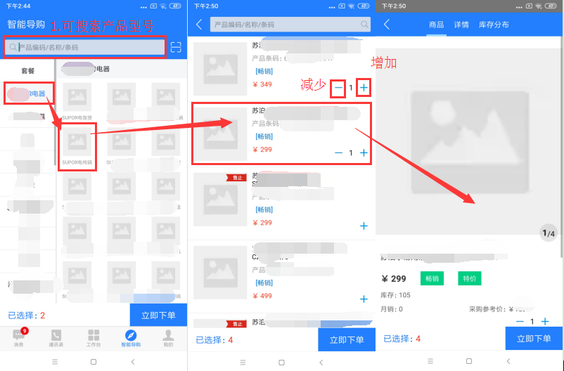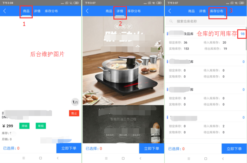 第三步:商品详情界面,可以查看商品参数、商品详情和商品的库存分布等信息。商品详情界面可以查看库存有多少,库存分布可以查看有权限的仓库的库存。