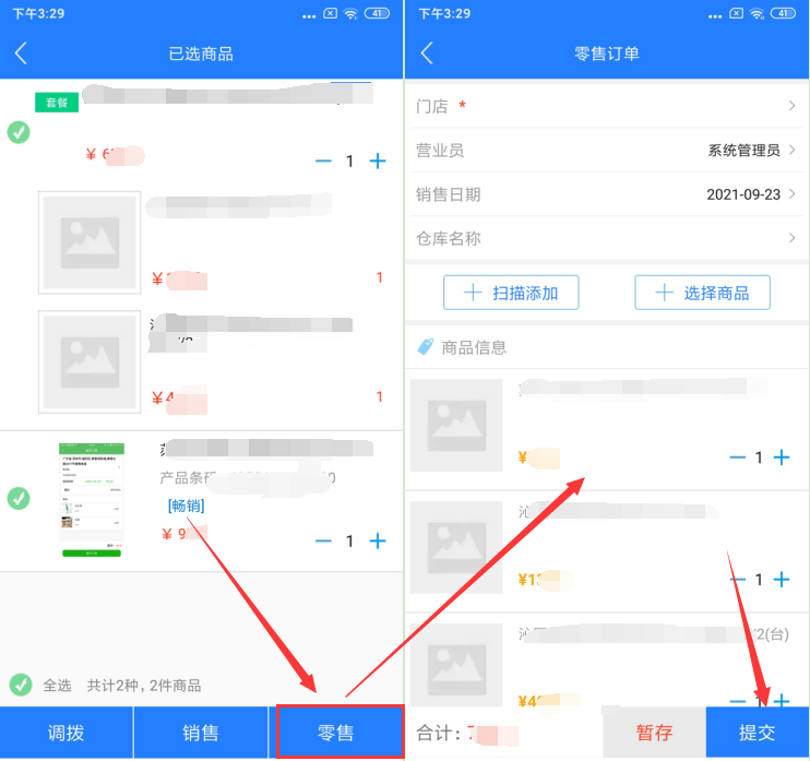已选商品列表,勾选商品后点击【零售】按钮,跳转到零售订单界面,选择门店信息后,点击提交,零售订单创建成功,清空已选商品列表商品记录。(跟正常零售订单流程一样操作)