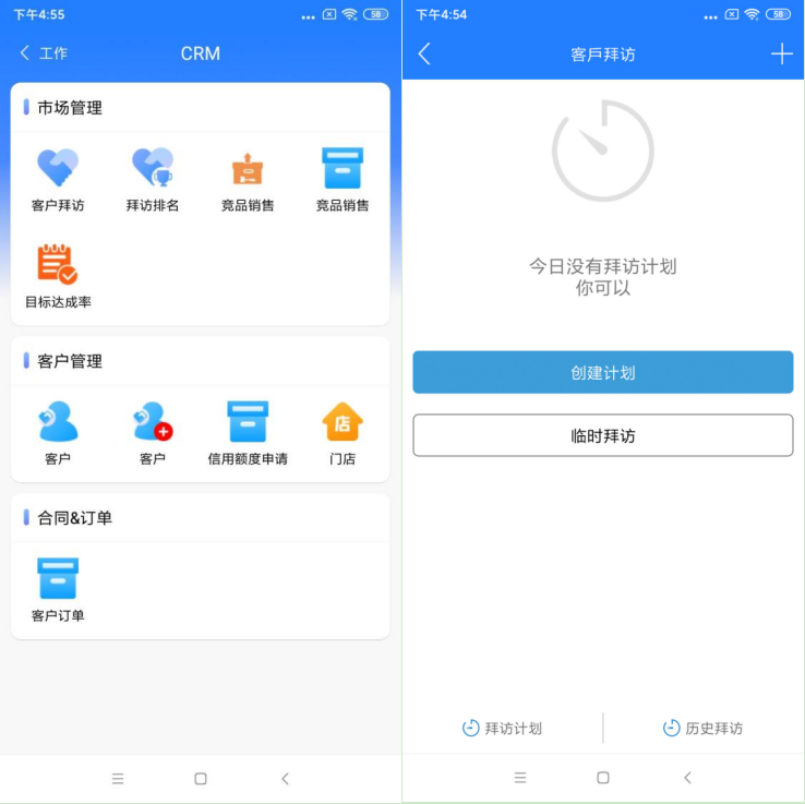 在【工作台—CRM—市场管理-客户拜访】 ,然后点击页面客户拜访图标,进入到客户拜访查看页面,客户拜访分为计划拜访以及临时拜访。