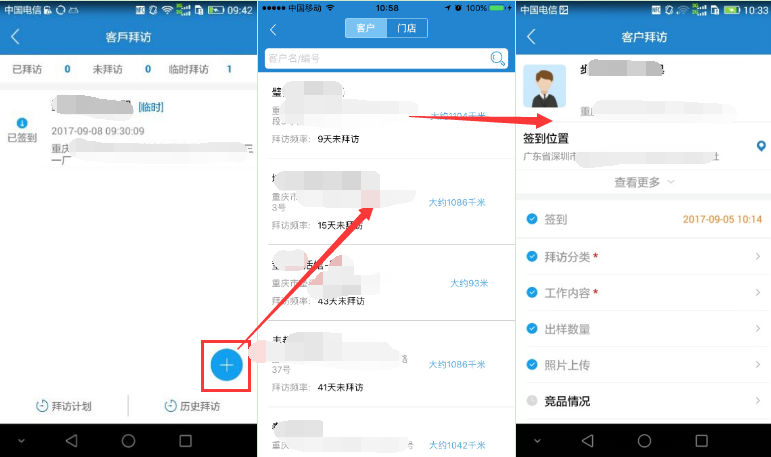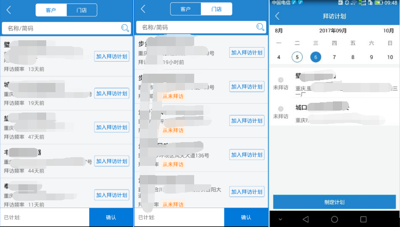 依据拜访计划的日期,会自动显示需要拜访的【客户】或【门店】;根据拜访结果,告知已拜访多少,未拜访多少,临时拜访多少;进行拜访计划工作,选择需要进行拜访【客户】或【门店】,填写拜访详情。