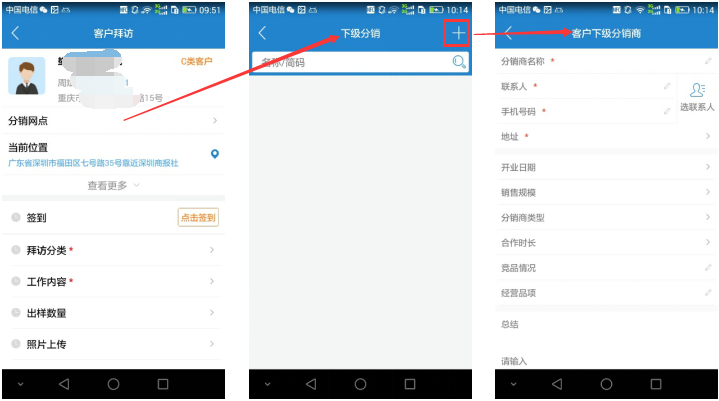 创建分销网点,在客户拜访里选择分销网点进入下级分销,选择右上角<+>;增加客户下级分销,点击<选联系人>可以从手机通讯录选择需要导入客户的联系人和手机号码。