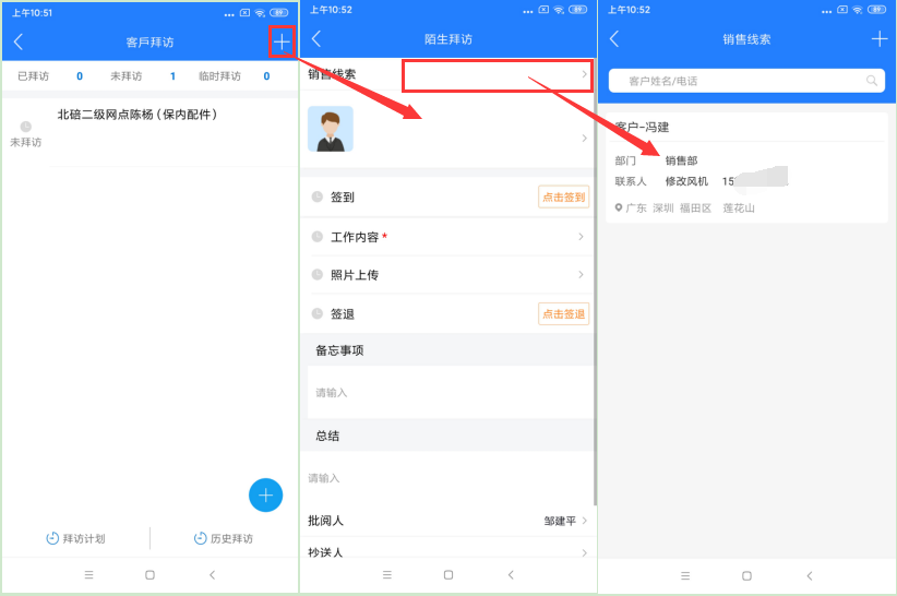 点击客户拜访右上角图标,进入陌生拜访界面。陌生拜访界面选择销售线索,添加后在陌生拜访显示销售线索记录。然后根据界面上的步骤进行操作。